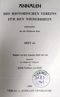 Annalen des Historischen Vereins für den Niederrhein, Heft 141, 1959, S.18, S. 34, S 477. |